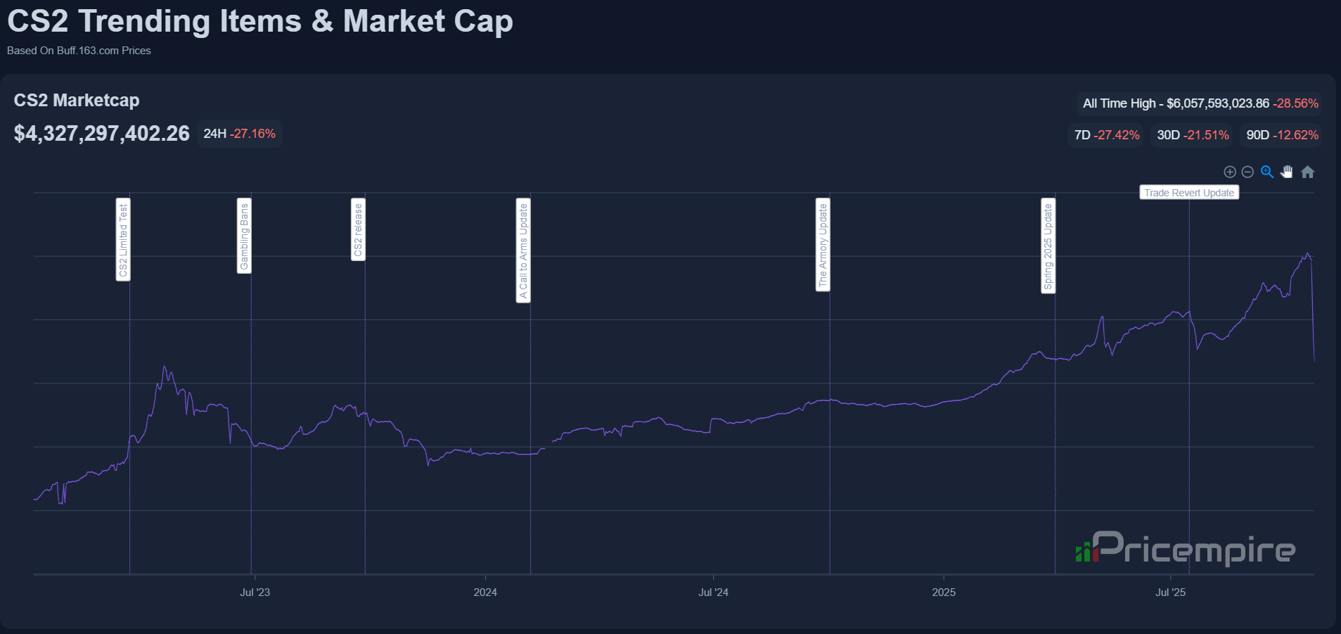 Selon PriceEmpire, la capitalisation du marché des skins CS2 a perdu près de 40 % en moins de 24 heures, soit environ 2 milliards de dollars. Les prix des couteaux et des gants se sont effondrés tandis que la demande sur les skins rouges a explosé, entraînant de nombreuses spéculations.